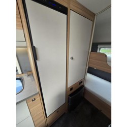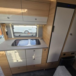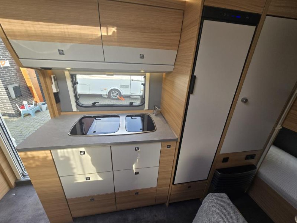 In de ruime treinzit vindt u een gezellige plek om te zitten, deze kan uiteraard ook dienen als extra slaapplaats. Het keukenblok, dat centraal in de caravan is gemonteerd, heeft voldoende bergruimte en is uitgerust met een 3-pits gascomfoor, spoelbak en kraan. Voor een snelle toevoer van warm water is er een boiler aanwezig. De koelkast met vriescompartiment is ruim genoeg voor al uw etenswaren. De keukenbenodigdheden vinden een plekje in de ladekast.
