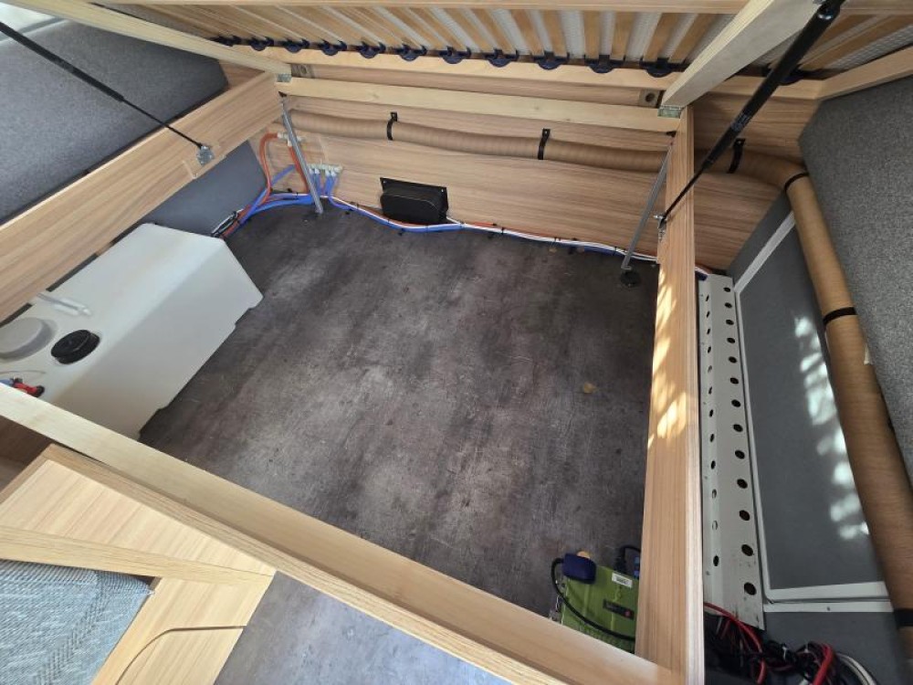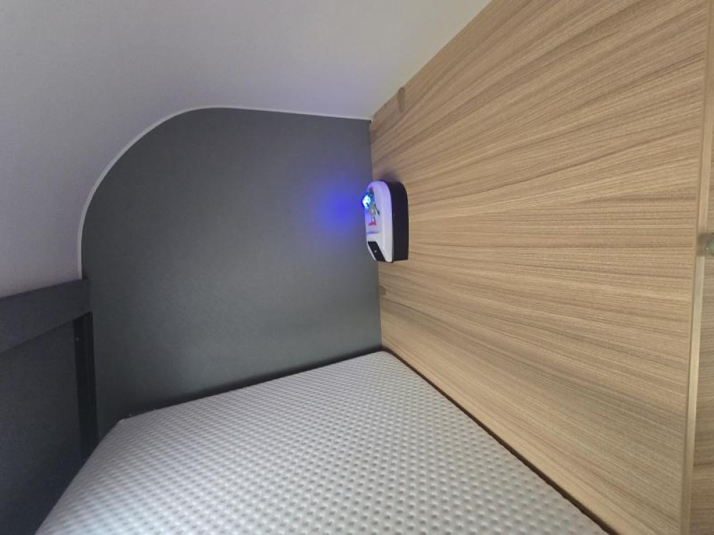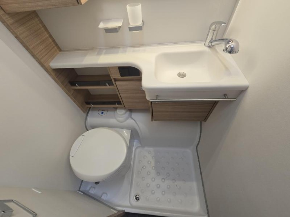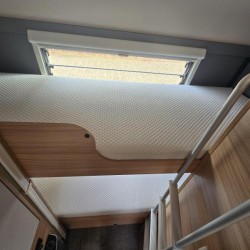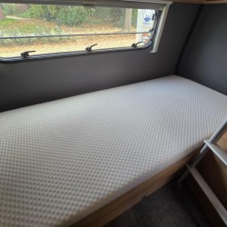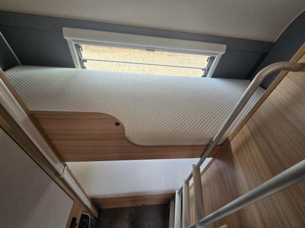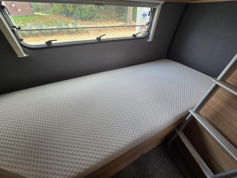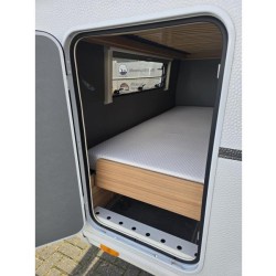 Het dwars geplaatste stapelbed is ideaal doordat het extra slaapplaatsen toevoegt zonder veel ruimte in beslag te nemen. Twee personen vinden voldoende plaats in het ruime dwars geplaatste bed. Om u van een welverdiende nachtrust te laten genieten, hebben de bedden niet alleen lattenbodems maar ook pocketveringsmatrassen. In de badkamer vindt u een wastafel om u op te frissen, alsmede een ingebouwd cassettetoilet.