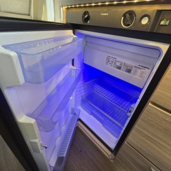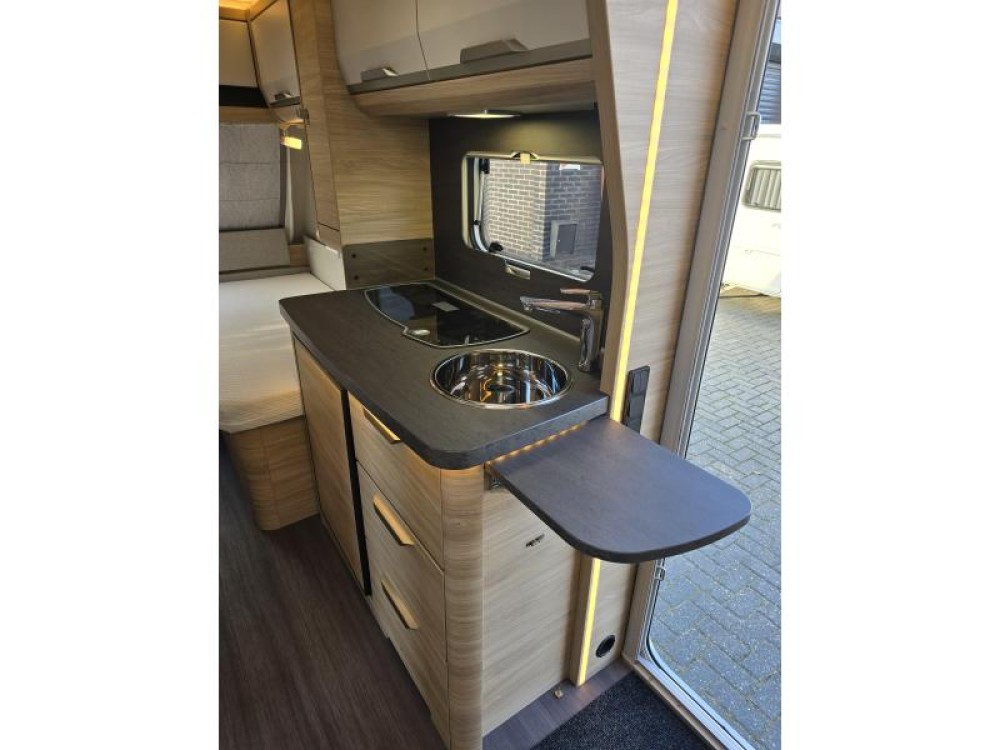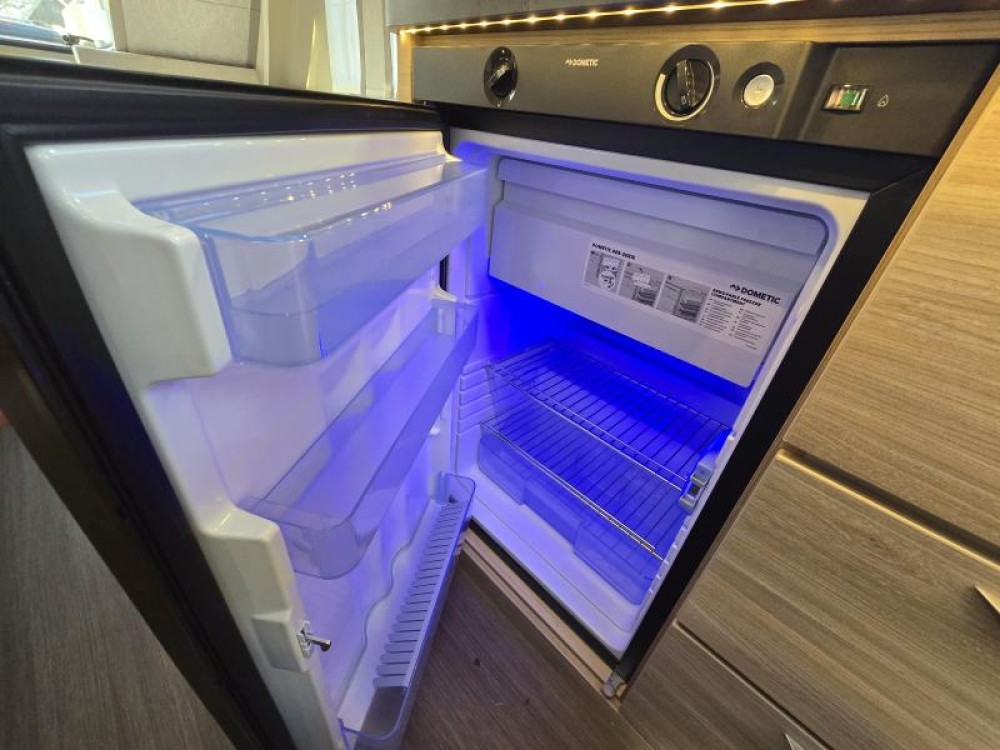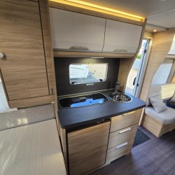 In de ruime treinzit vindt u een gezellige plek om te zitten, deze kan uiteraard ook dienen als extra slaapplaats. De middenkeuken is zeer compleet uitgevoerd. Er is een warmwatervoorziening in de vorm van een boiler aanwezig. De ingebouwde koelkast met vriesvak is uitgevoerd in een ruime uitvoering. De ladekast biedt u een fraaie bergplaats voor al uw keukenspulletjes.