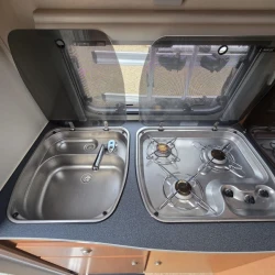 Een prima gelegenheid om gezellig te eten, drinken, lezen en borrelen wordt gevormd door de treinzit. De keuken, die aan de achterzijde van de caravan is geplaatst, is uitgerust met een 3-pits gascomfoor, spoelbak en kraan. De koelkast met vriesvak biedt voldoende ruimte voor heel uw voorraad.