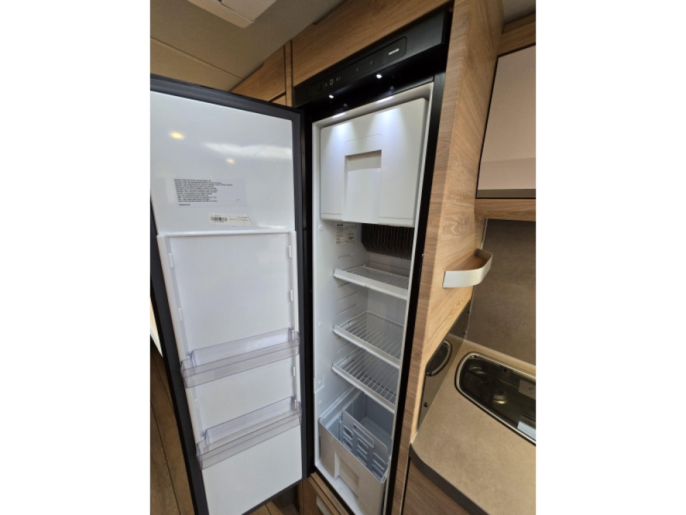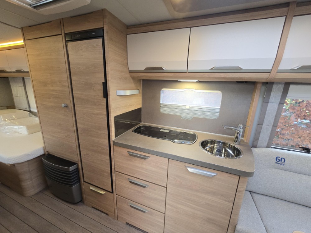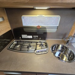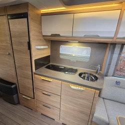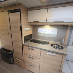 De caravan beschikt over een treinzit. Handig als extra slaapplaats en om samen te eten en te drinken. De middenkeuken, waar de caravan over beschikt, is onder meer voorzien van een 3-pits kooktoestel, spoelbak en kraan. Voor een snelle toevoer van warm water is er een boiler aanwezig. De koelkast met vriescompartiment is ruim genoeg voor al uw etenswaren. Alle keukenbenodigdheden kunnen worden opgeborgen in de ladekast.