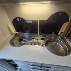 - Keuken achterin met 3-pits gasfornuis en spoelbak met veel opbergruimte erboven en eronder