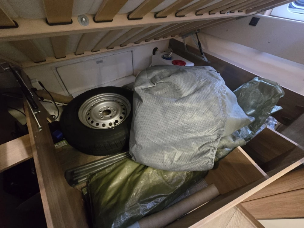 - Frans bed (1,95 x 1,38) met grote bergruimte eronder en een serviceluik waardoor spullen ook