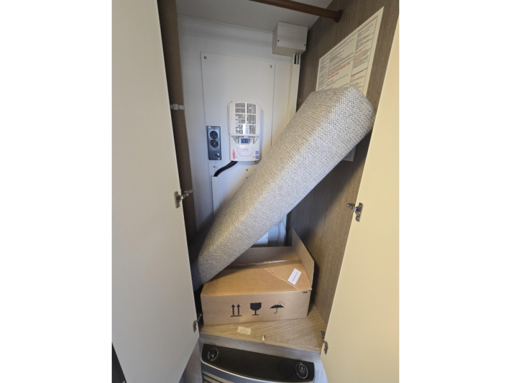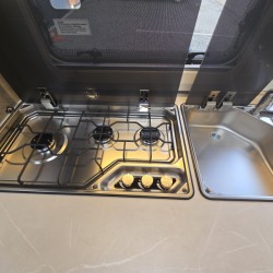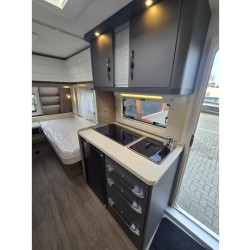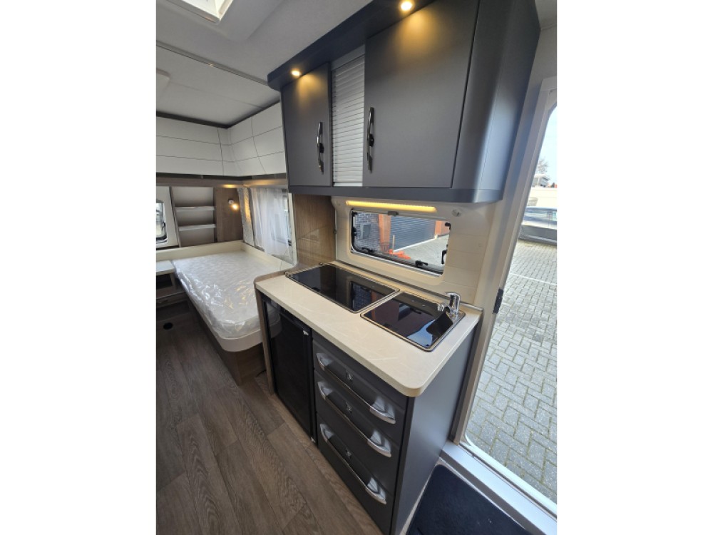 Een extra slaapgelegenheid wordt gevormd door de comfortabele, gezellige treinzit. De keuken is in het midden van de caravan geplaatst. Er is voldoende bergruimte, uiteraard zijn er ook een 3-pits kooktoestel en gootsteen met kraan aanwezig. Voor een snelle toevoer van warm water is er een boiler aanwezig. De koelkast met vriescompartiment is ruim genoeg voor al uw etenswaren. De praktische ladekast is een handige plek voor de keukenbenodigdheden.
