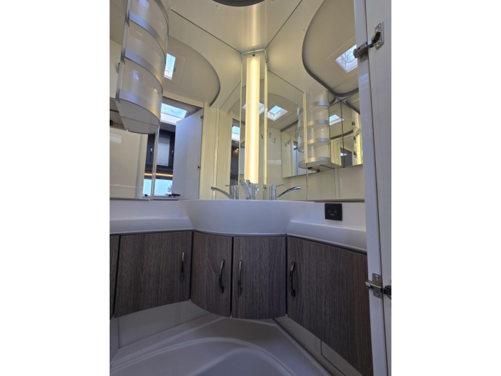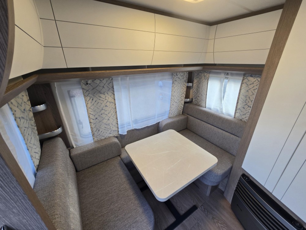 Het grote dakluik van de caravan zorgt voor extra veel lichtinval en een goede ventilatie. De verwarmde lucht wordt efficiënt verspreid via een ringverwarming.