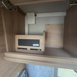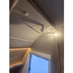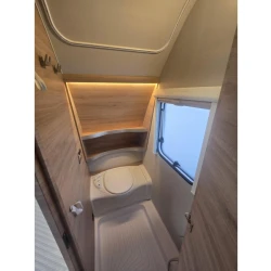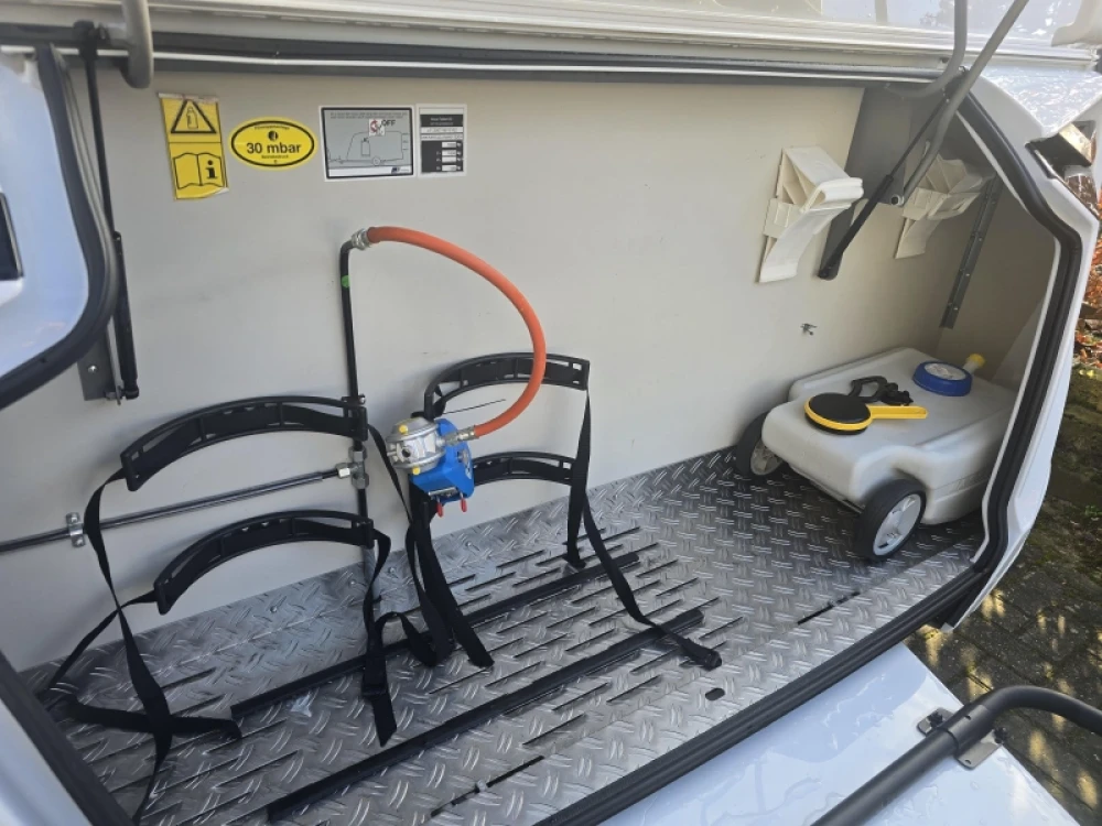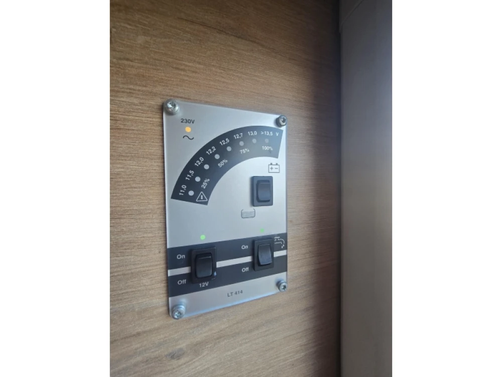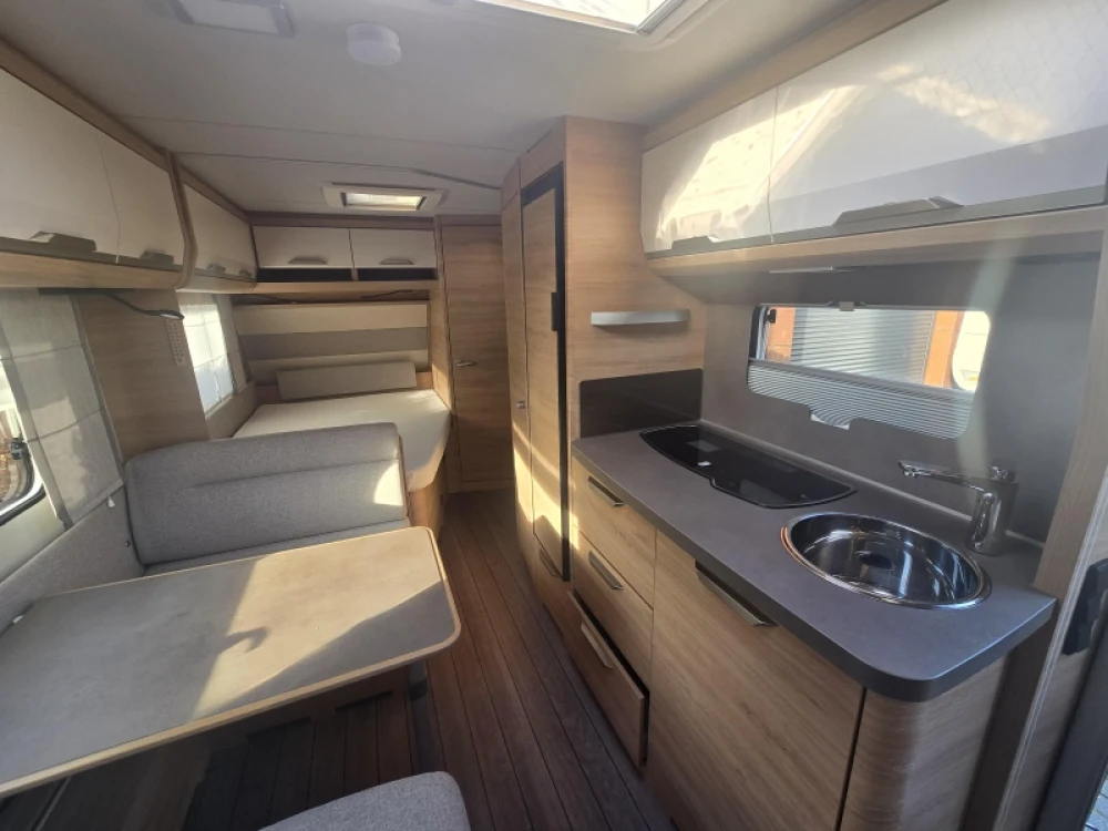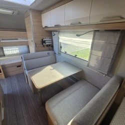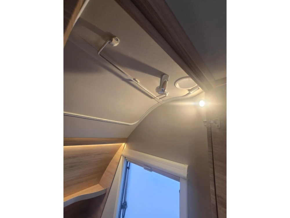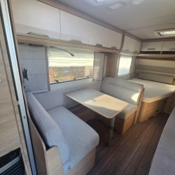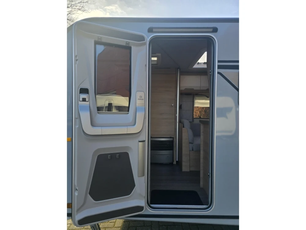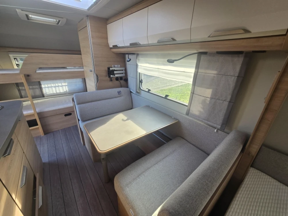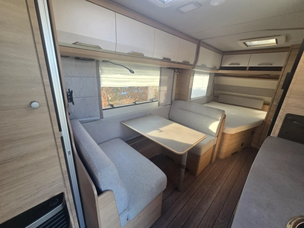 Het grote dakluik van de caravan zorgt voor extra veel lichtinval en een goede ventilatie. De verwarmde lucht wordt efficiënt verspreid via een ringverwarming. De caravan is tevens uitgerust met een huishoudaccu (autark pakket) waarmee u dus ook off-grid stroom aan boord heeft voor het doorspoelen van uw toilet en de verlichting kunt gebruiken.
