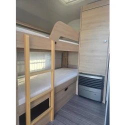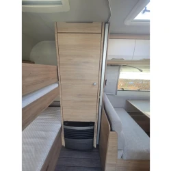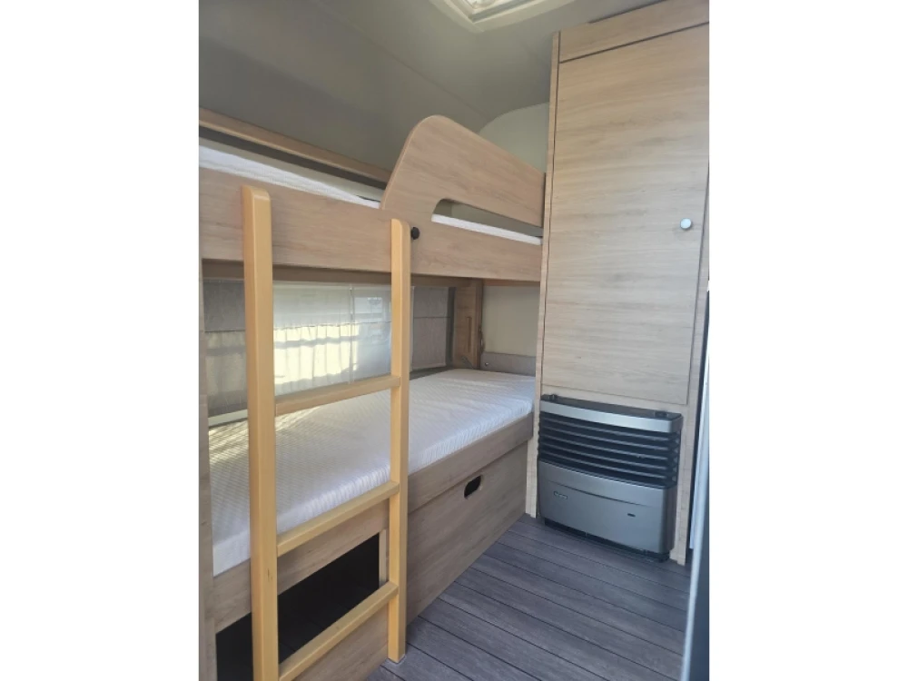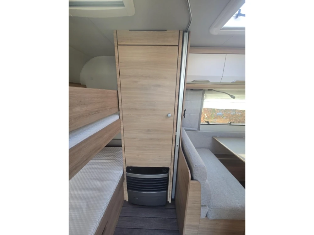 Het ruime, in de lengte geplaatste Franse bed is geschikt voor 2 personen. De kinderen zullen zich direct thuis voelen in het dwars geplaatste stapelbed. Om u van een welverdiende nachtrust te laten genieten, hebben de bedden niet alleen lattenbodems maar ook pocketveringsmatrassen. In de comfortabele badkamer van deze caravan vindt u behalve een wastafel ook een ingebouwd cassettetoilet. Naast het slaapgedeelte bevindt zich ook de douchegelegenheid.