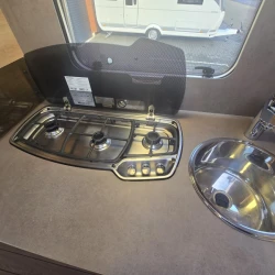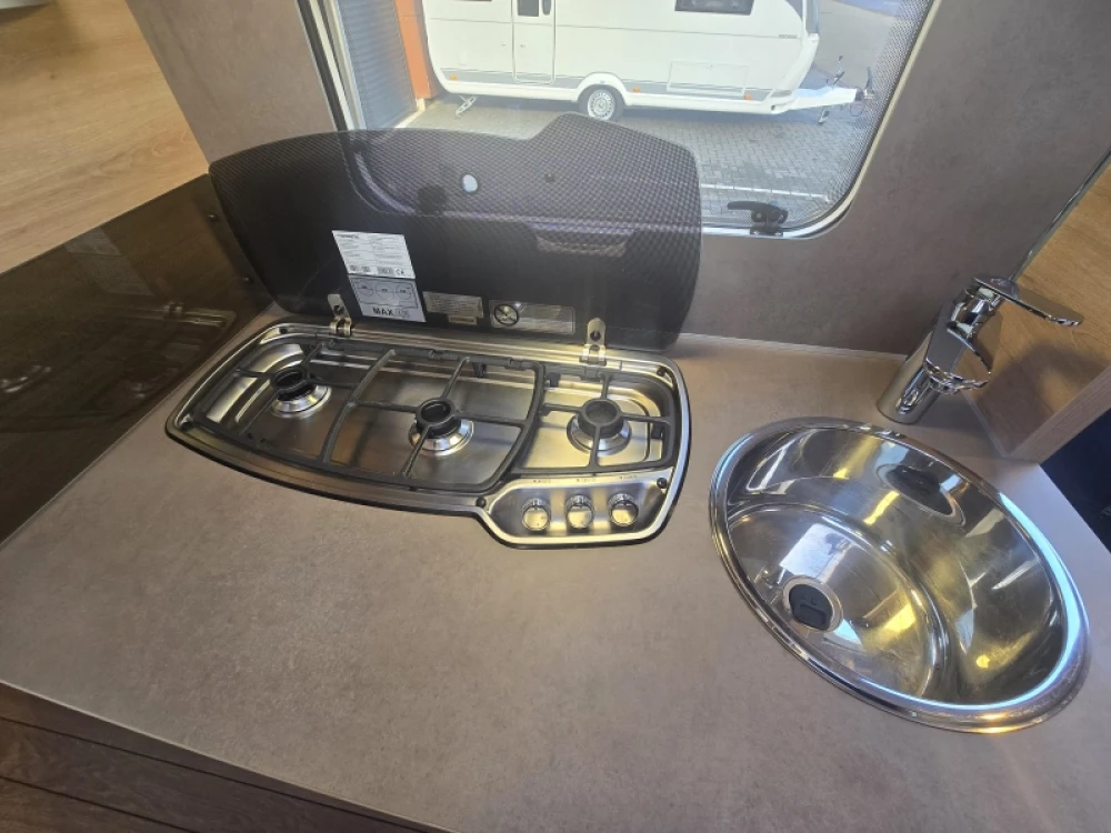 In de ruime treinzit vindt u een gezellige plek om te zitten, deze kan uiteraard ook dienen als extra slaapplaats. De keuken is in het midden van de caravan geplaatst. Er is voldoende bergruimte, uiteraard zijn er ook een 3-pits kooktoestel en gootsteen met kraan aanwezig. Er is een warmwatervoorziening in de vorm van een boiler aanwezig. De koelkast met vriescompartiment is ruim genoeg voor al uw etenswaren. De keukenbenodigdheden vinden een plekje in de ladekast.