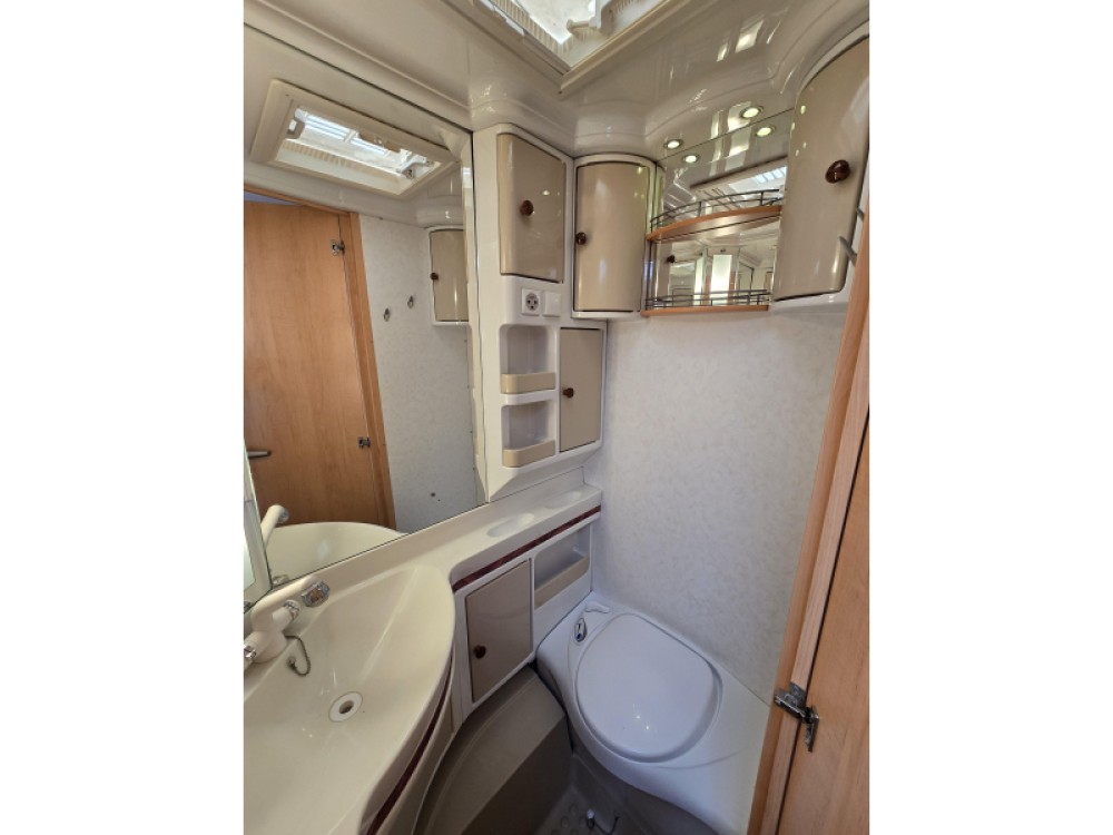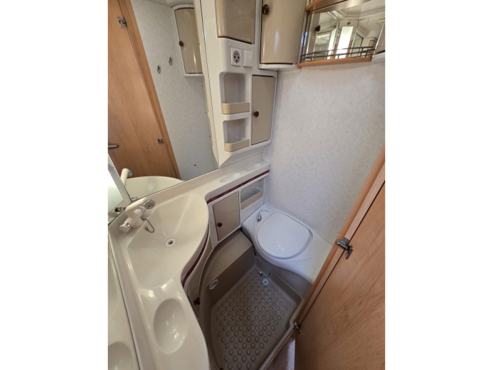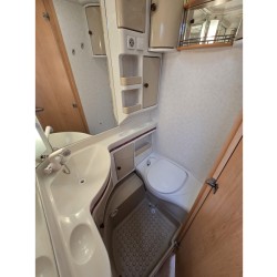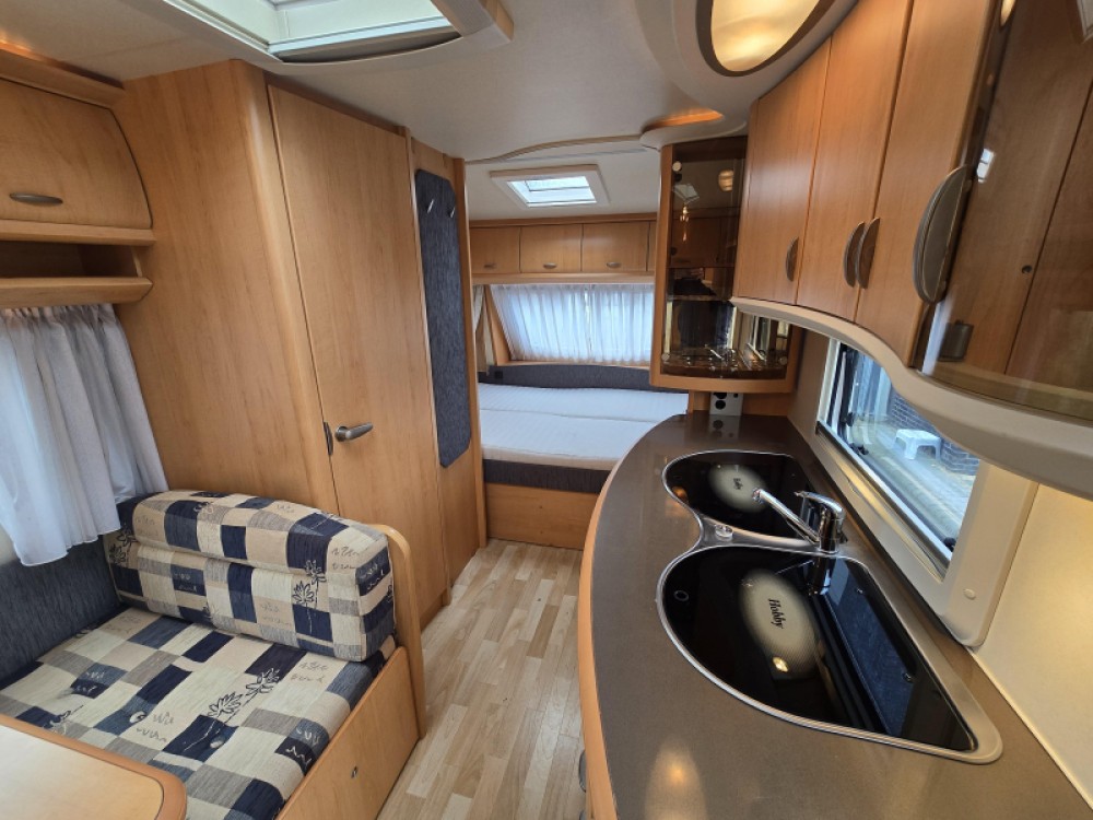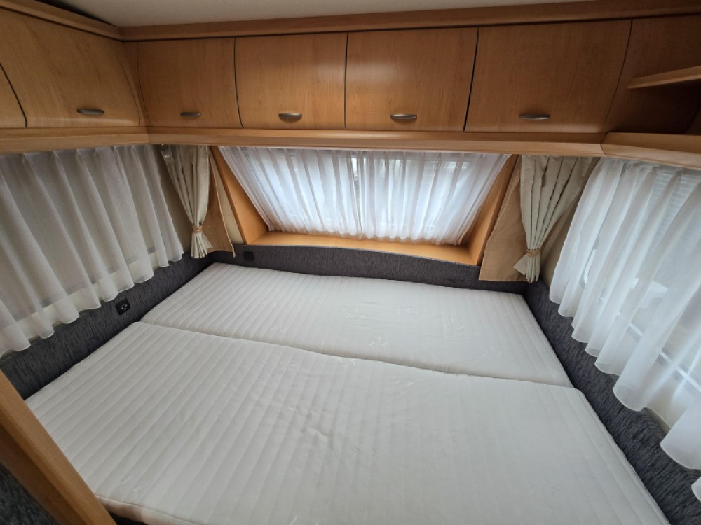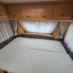 Twee personen vinden voldoende plaats in het ruime dwars geplaatste bed. Om u van een welverdiende nachtrust te laten genieten, hebben de bedden niet alleen lattenbodems maar ook pocketveringsmatrassen. Deze caravan beschikt over een badkamer. Hierin bevindt zich een wastafel en ingebouwd cassettetoilet.