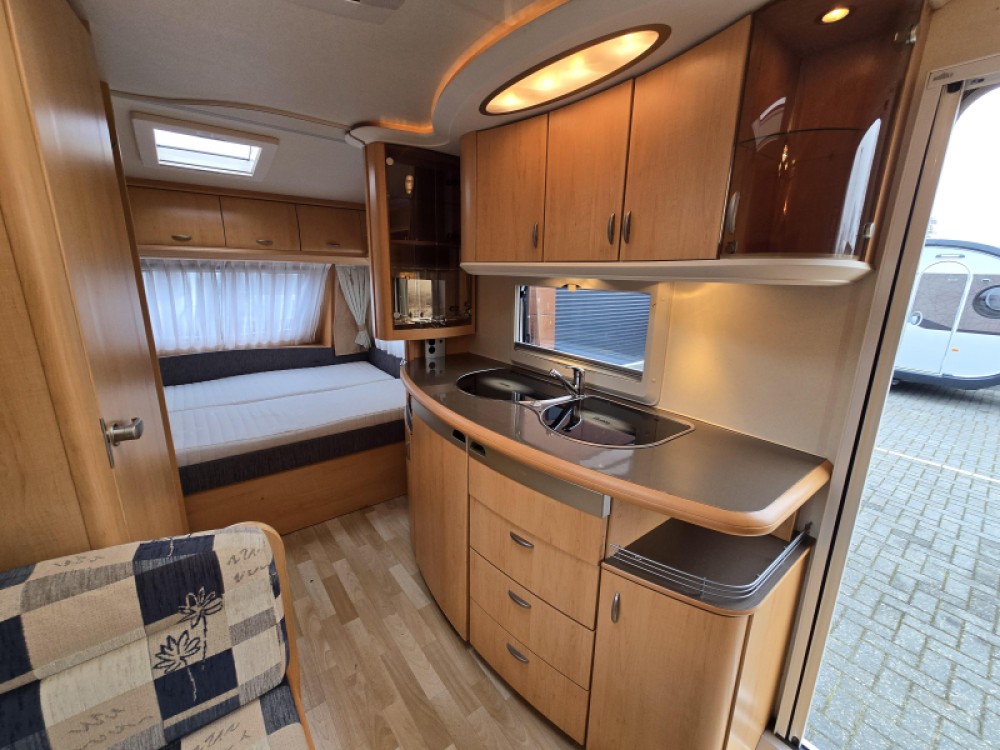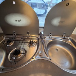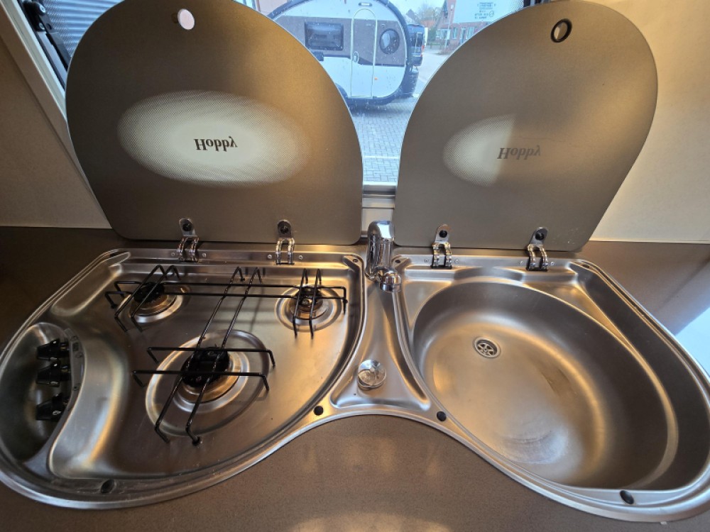 Een prima gelegenheid om gezellig te eten, drinken, lezen en borrelen wordt gevormd door de treinzit. Centraal in de caravan bevindt zich de praktisch ingedeelde en ruime middenkeuken, welke geheel compleet is uitgerust met een spoelbak, kraan en 3-pits kooktoestel. De inbouwkoelkast met vriescompartiment heeft een grote inhoud.