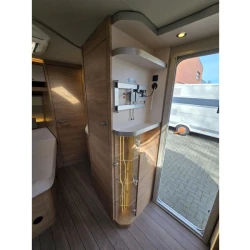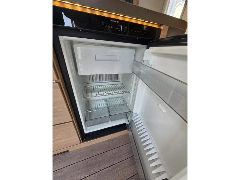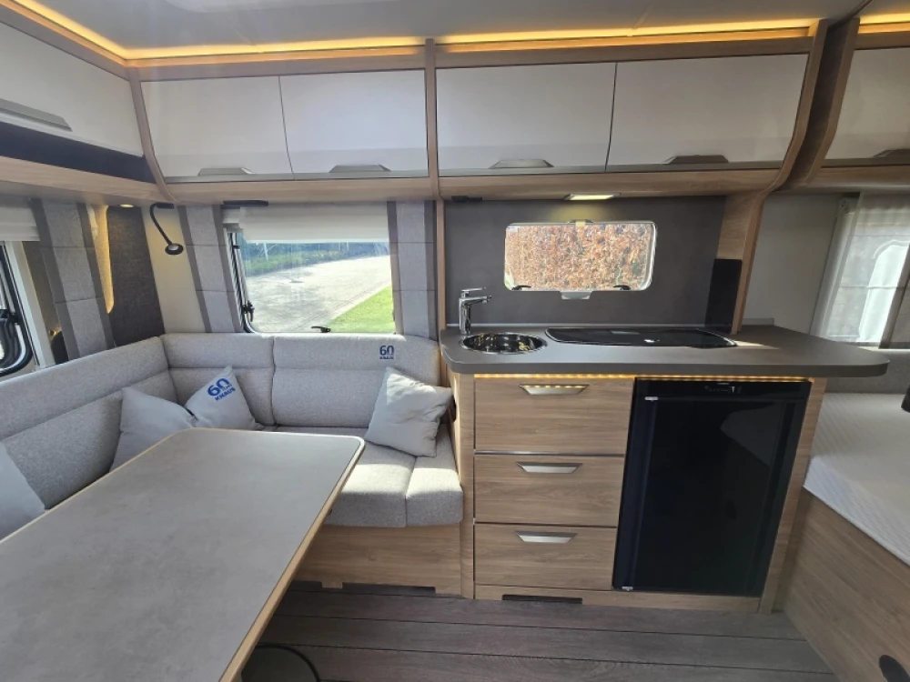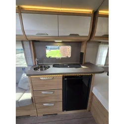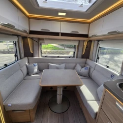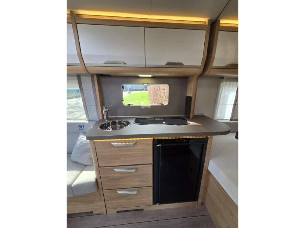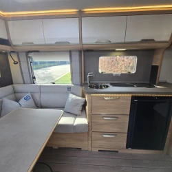 De caravan beschikt over een treinzit. Handig als extra slaapplaats en om samen te eten en te drinken. De middenkeuken, waar de caravan over beschikt, is onder meer voorzien van een 3-pits kooktoestel, spoelbak en kraan. Voor een snelle toevoer van warm water is er een boiler aanwezig. De koelkast met vriescompartiment is ruim genoeg voor al uw etenswaren. Alle keukenbenodigdheden kunnen worden opgeborgen in de ladekast.
