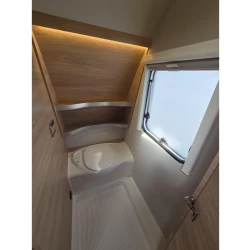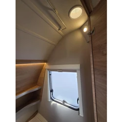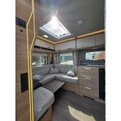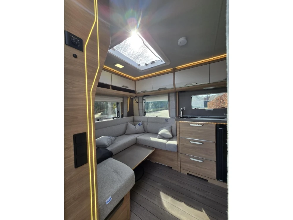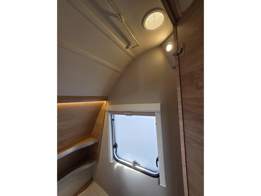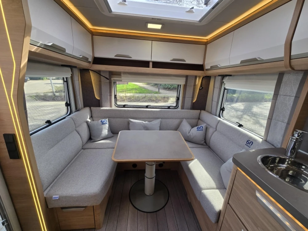 Het grote dakluik van de caravan zorgt voor extra veel lichtinval en een goede ventilatie. Voor een goede verdeling van de verwarmde lucht is de caravan voorzien van een circulatiesysteem.