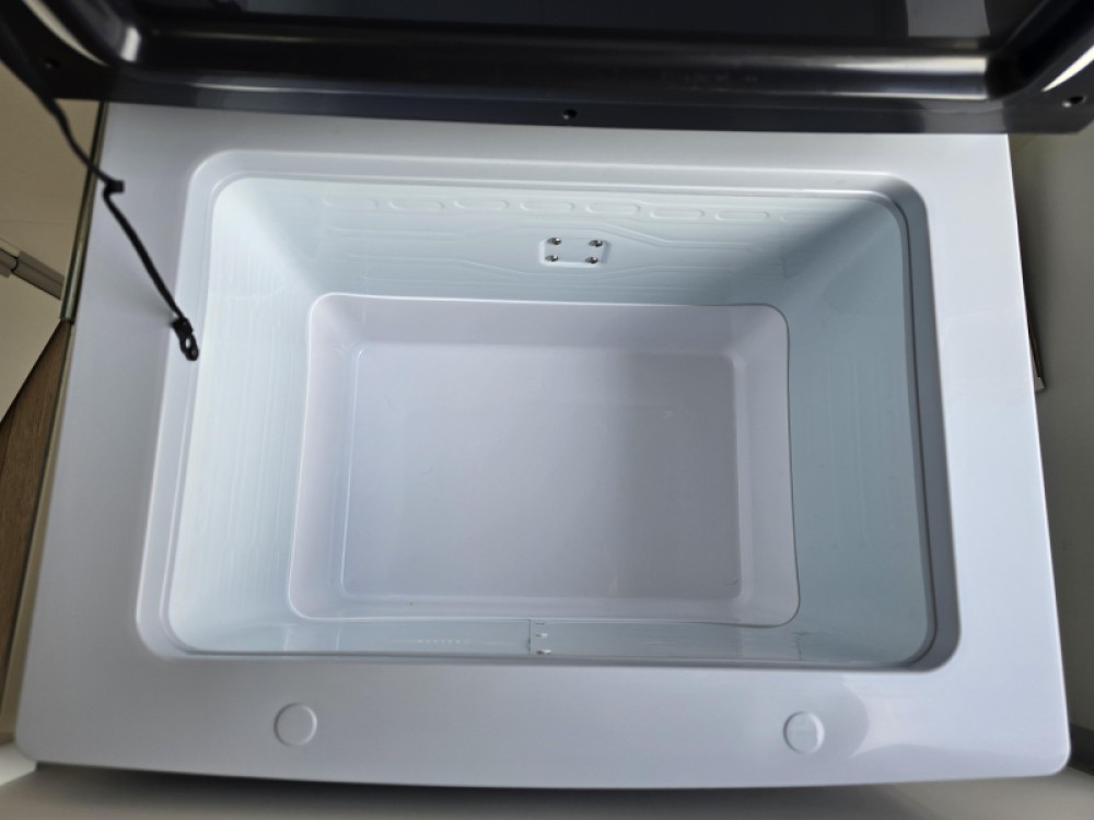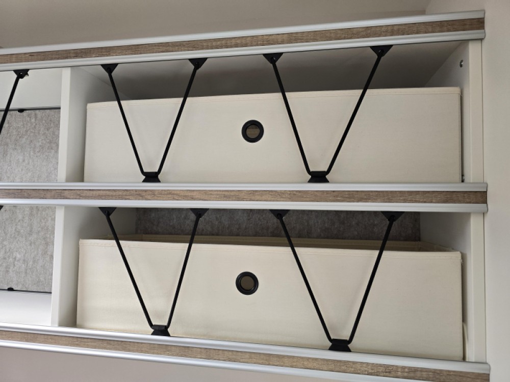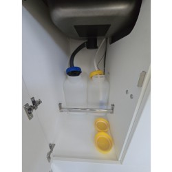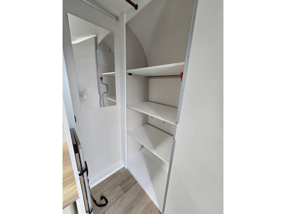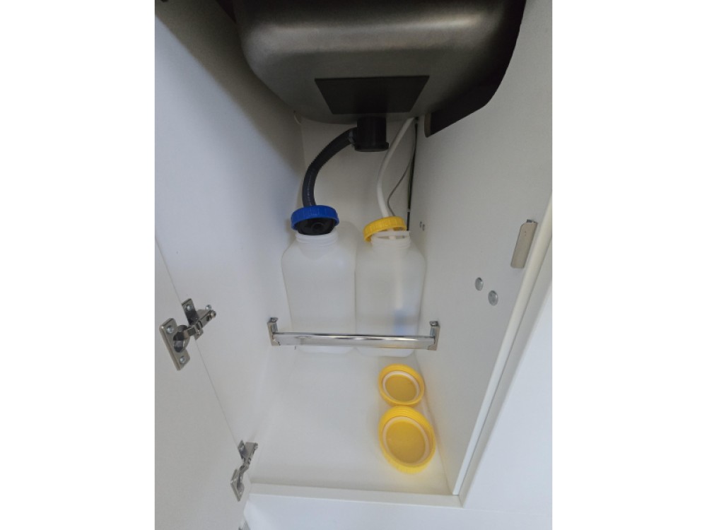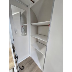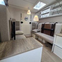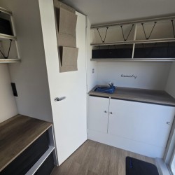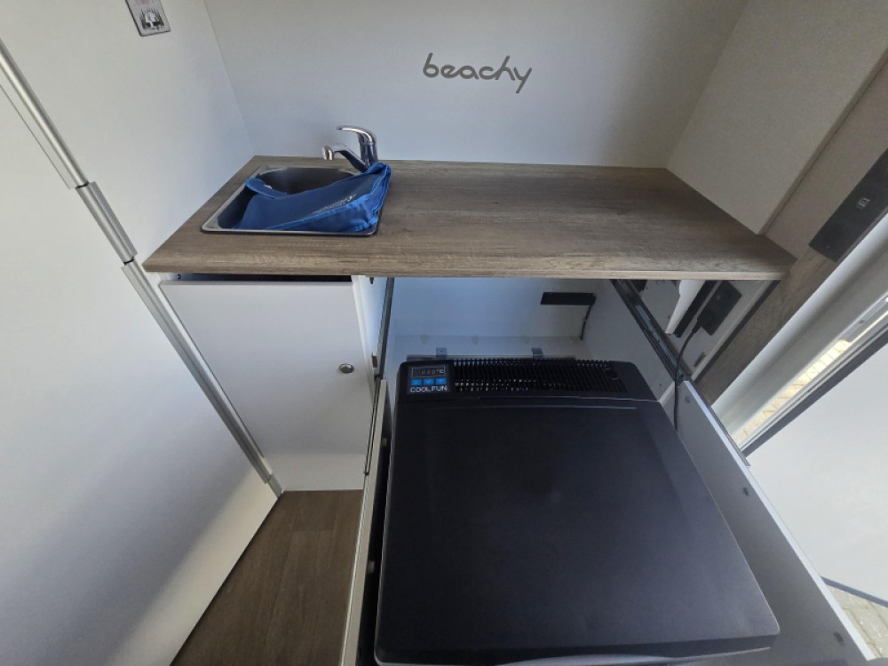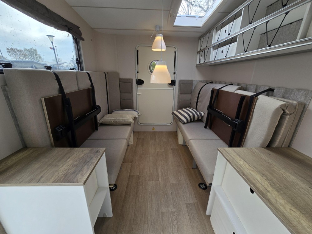 Een extra slaapgelegenheid wordt gevormd door de comfortabele, gezellige treinzit. De keuken is aan de achterzijde van de caravan geplaatst. De koelkast is een lademodel, hierdoor kunt u makkelijk bij uw etenswaren komen. De praktische ladekast is een handige plek voor de keukenbenodigdheden.