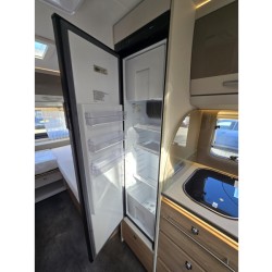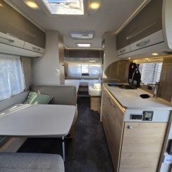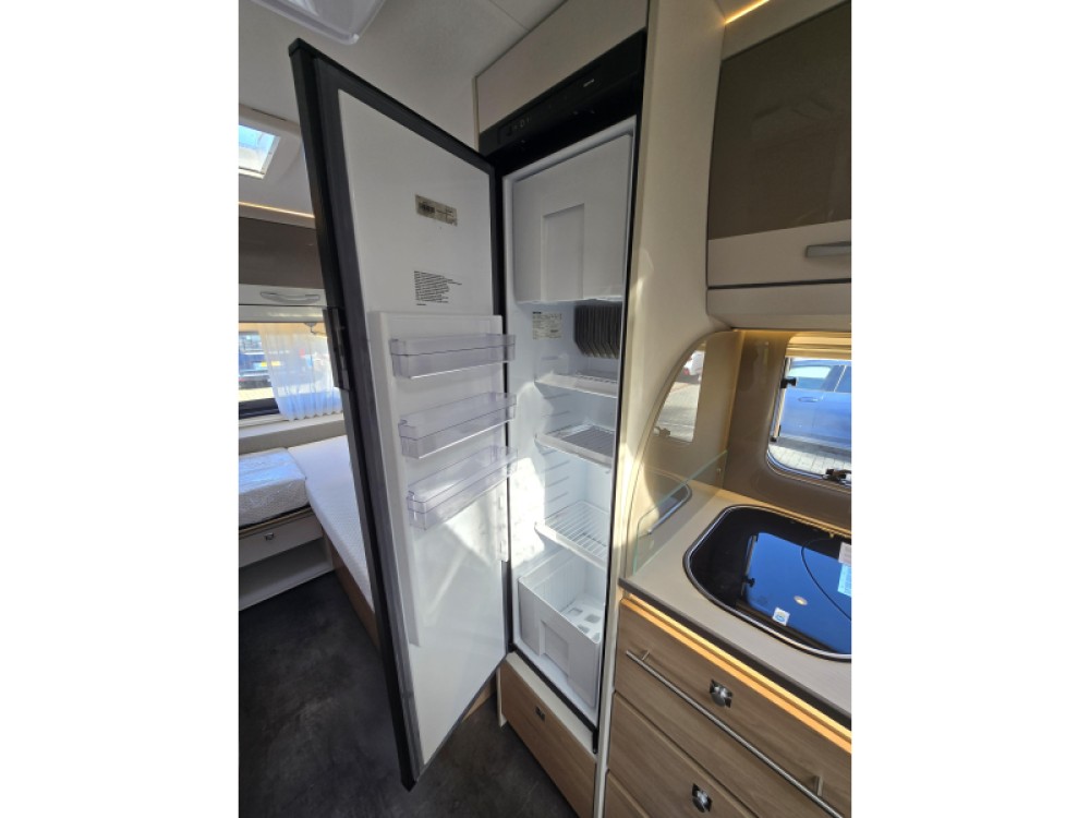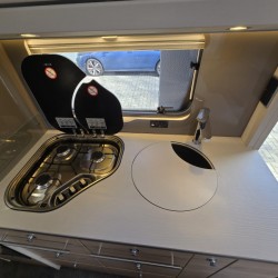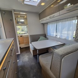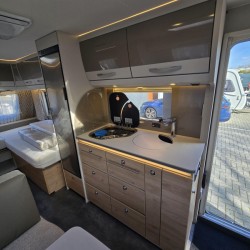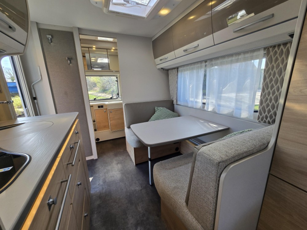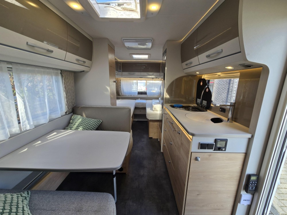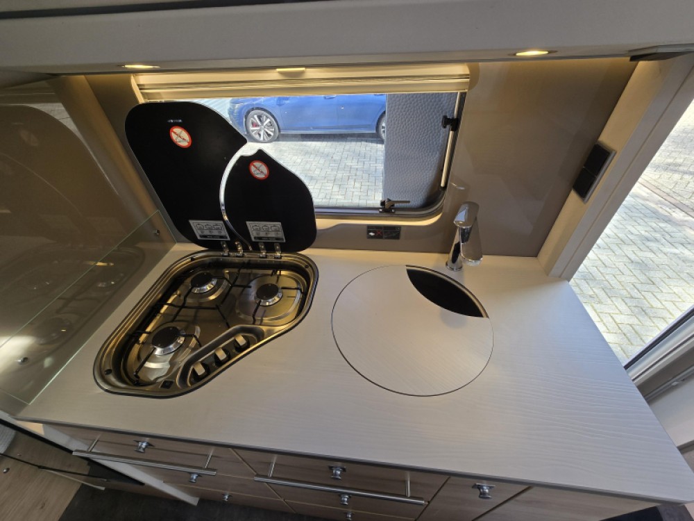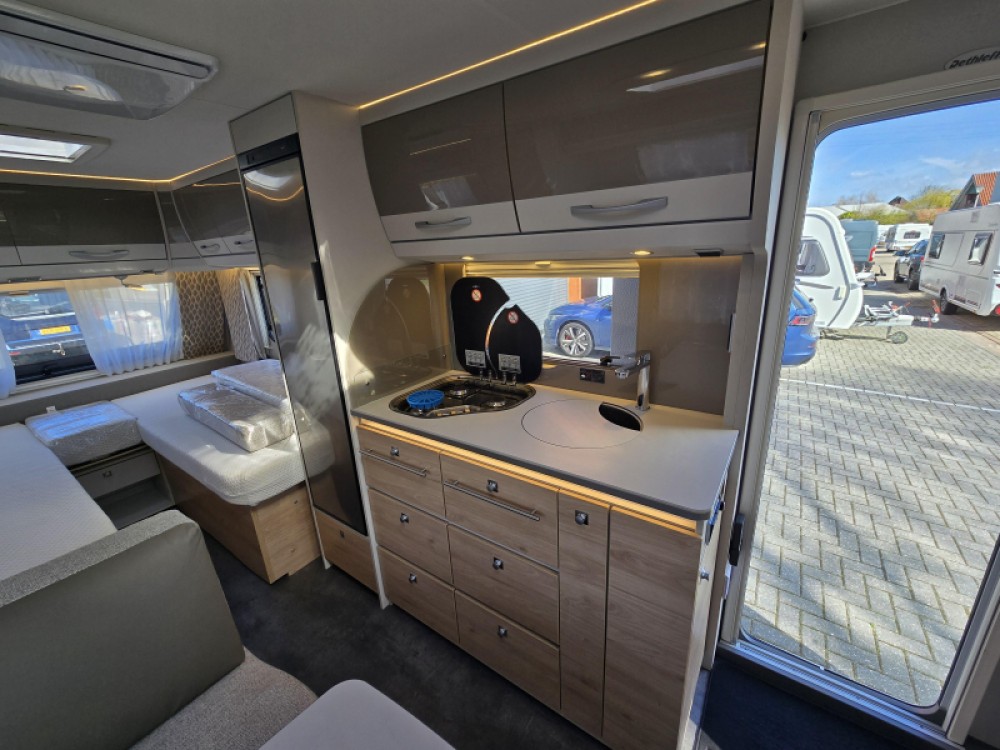 De caravan beschikt over een treinzit. Handig als extra slaapplaats en om samen te eten en te drinken. De keuken is in het midden van de caravan geplaatst. Er is voldoende bergruimte, uiteraard zijn er ook een 3-pits kooktoestel en gootsteen met kraan aanwezig. Voor een snelle toevoer van warm water is er een boiler aanwezig. De koelkast met vriesvak biedt voldoende ruimte voor heel uw voorraad. Al uw keukenspullen passen in de handige ladekast.