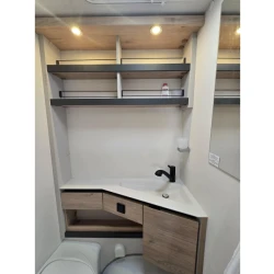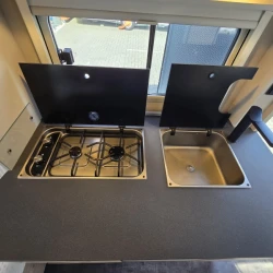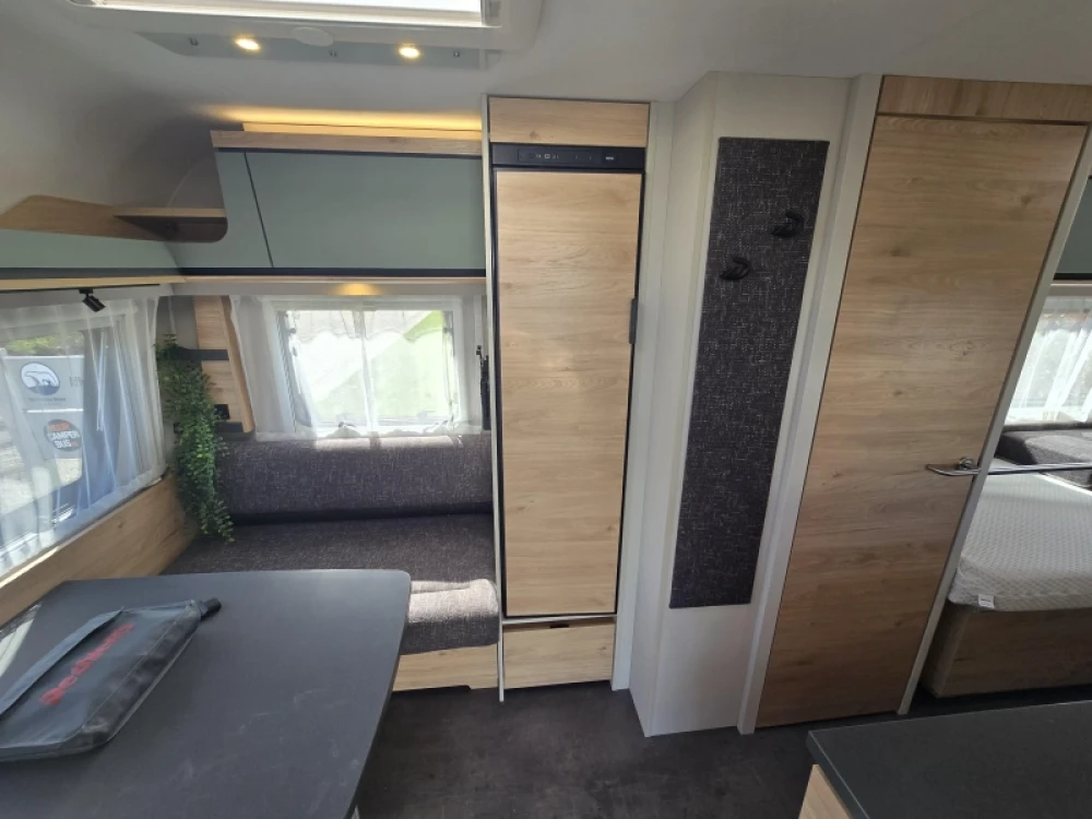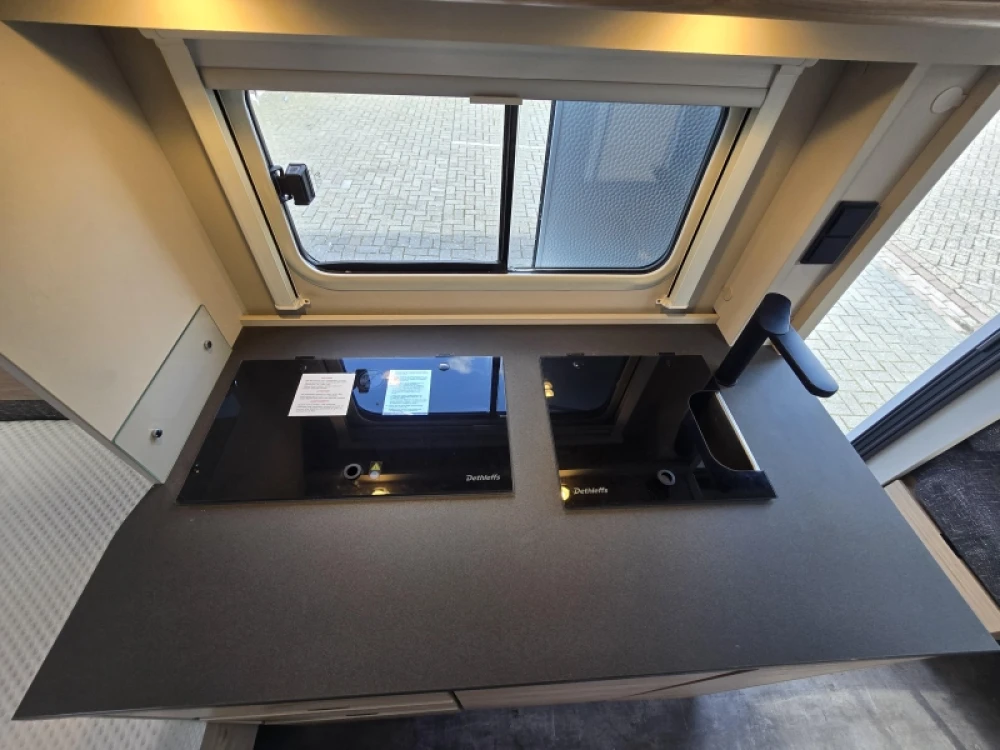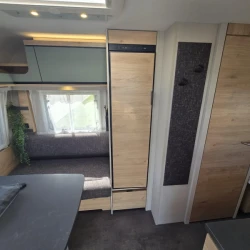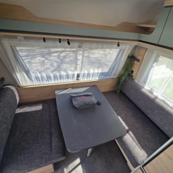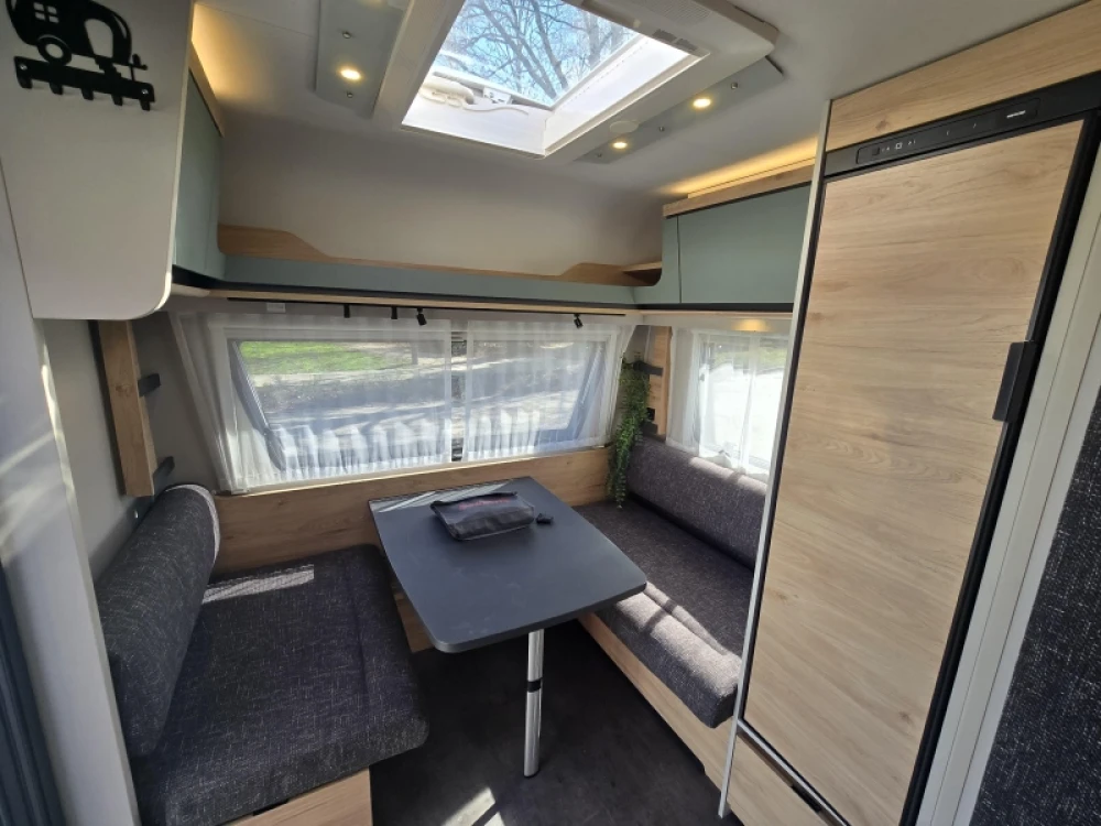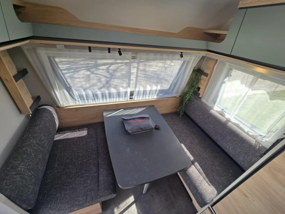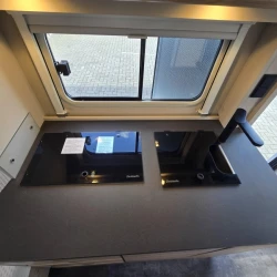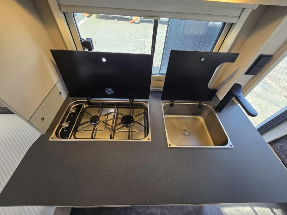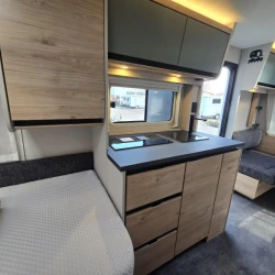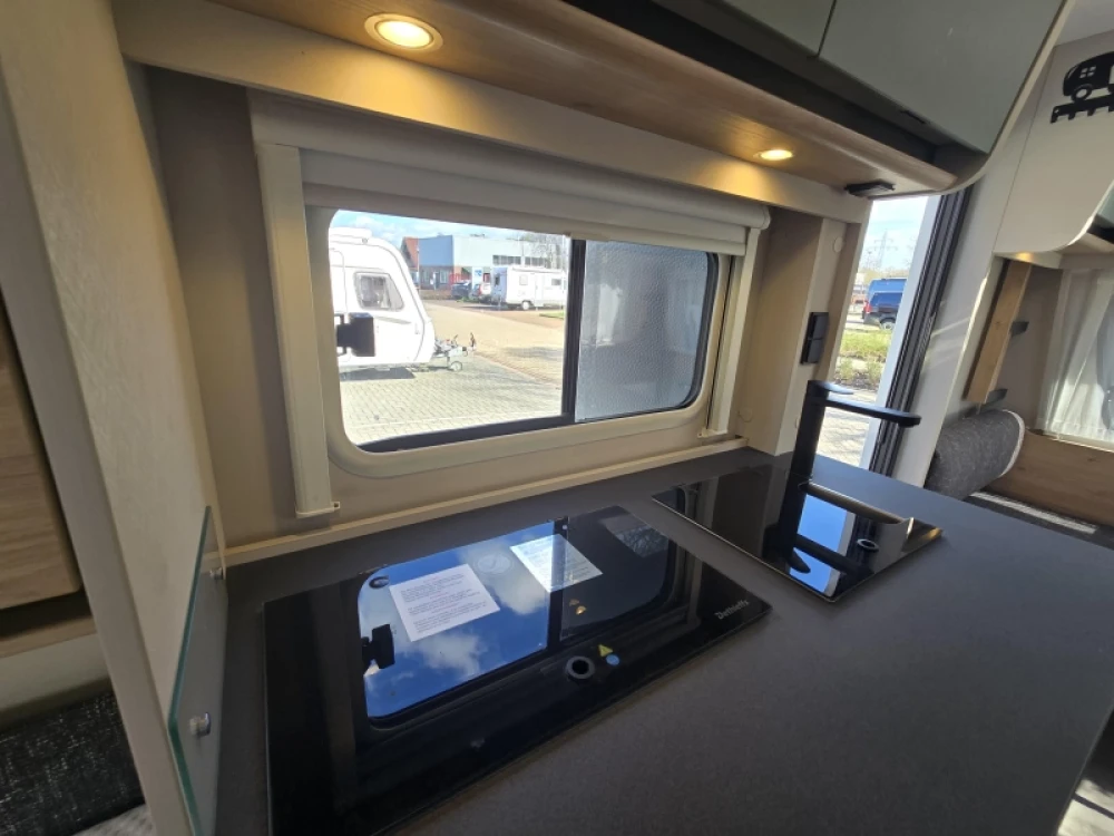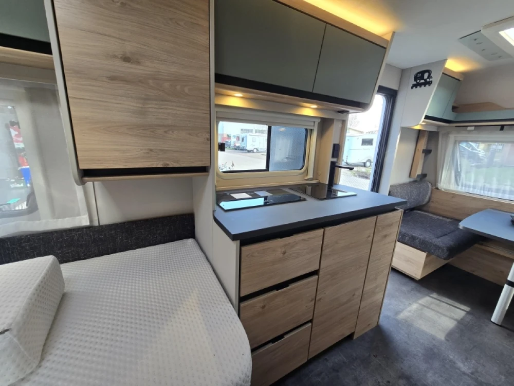 In de ruime treinzit vindt u een gezellige plek om te zitten, deze kan uiteraard ook dienen als extra slaapplaats. De keuken is in het midden van de caravan geplaatst. Er is voldoende bergruimte, uiteraard zijn er ook een 2-pits kooktoestel en gootsteen met kraan aanwezig. Er is een warmwatervoorziening in de vorm van een boiler aanwezig. De inbouwkoelkast met vriescompartiment heeft een grote inhoud. Alle keukenbenodigdheden kunnen worden opgeborgen in de ladekast.