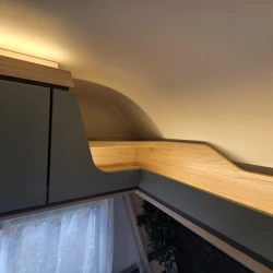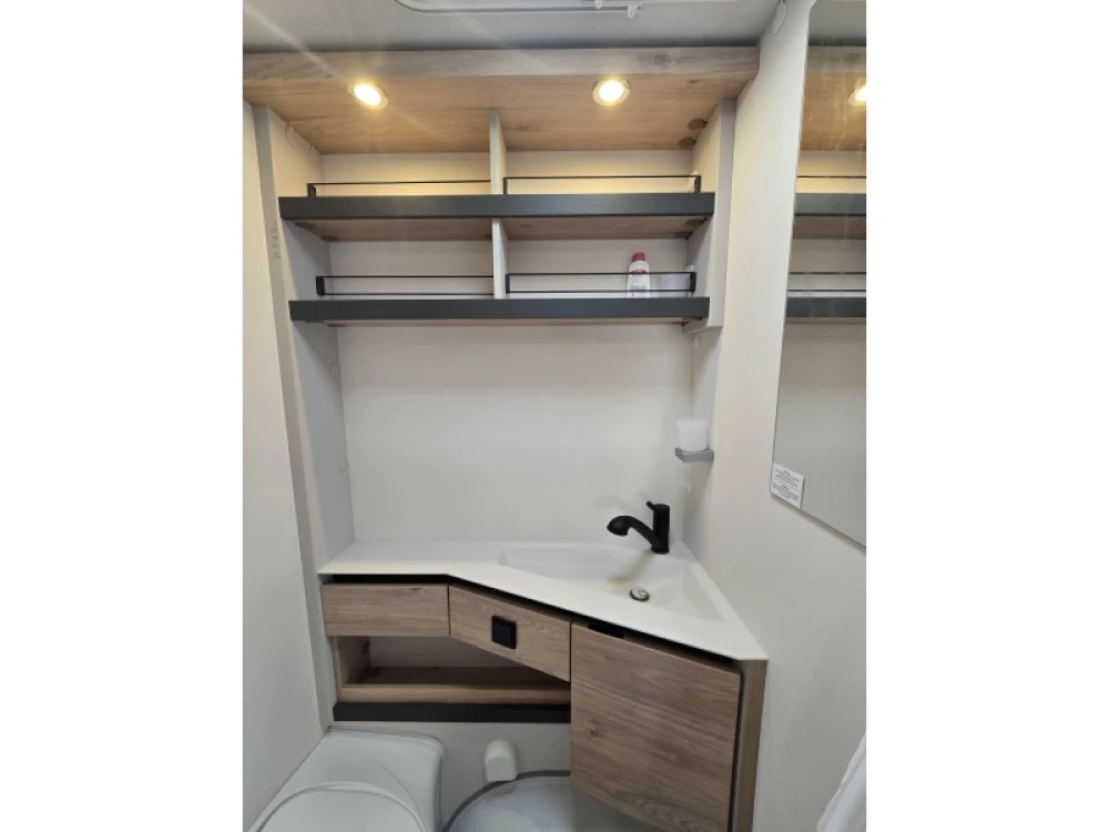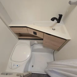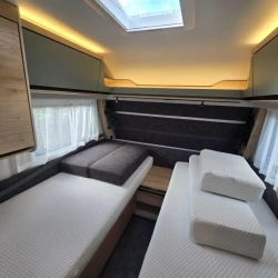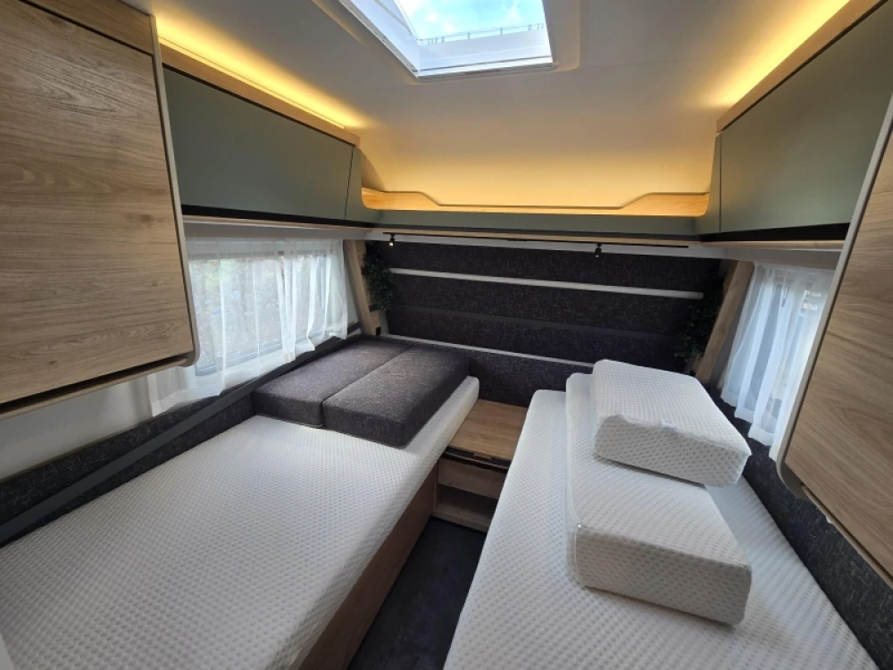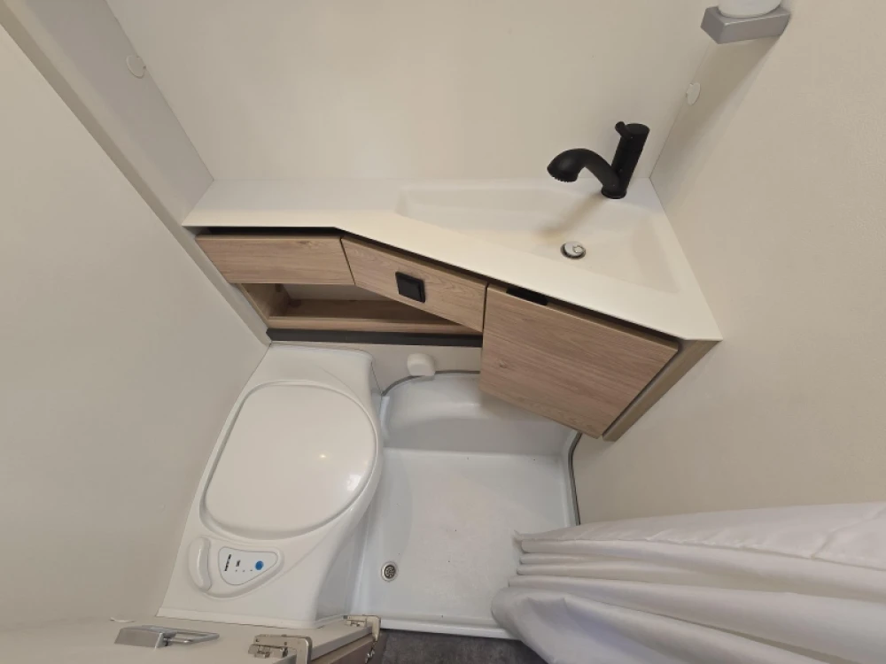 In de caravan vindt u onder meer een ruim tweepersoons bed dat in de lengte is geplaatst. Dankzij de pocketveringsmatrassen en lattenbodems op de bedden kunt u genieten van een extra comfortabele ligging. In de badkamer vindt u niet alleen een wastafel, maar ook een ingebouwd cassettetoilet. Naast het slaapgedeelte bevindt zich ook de douchegelegenheid.