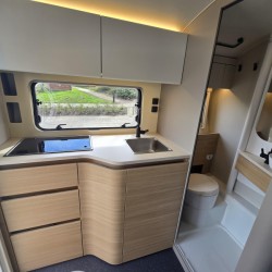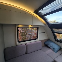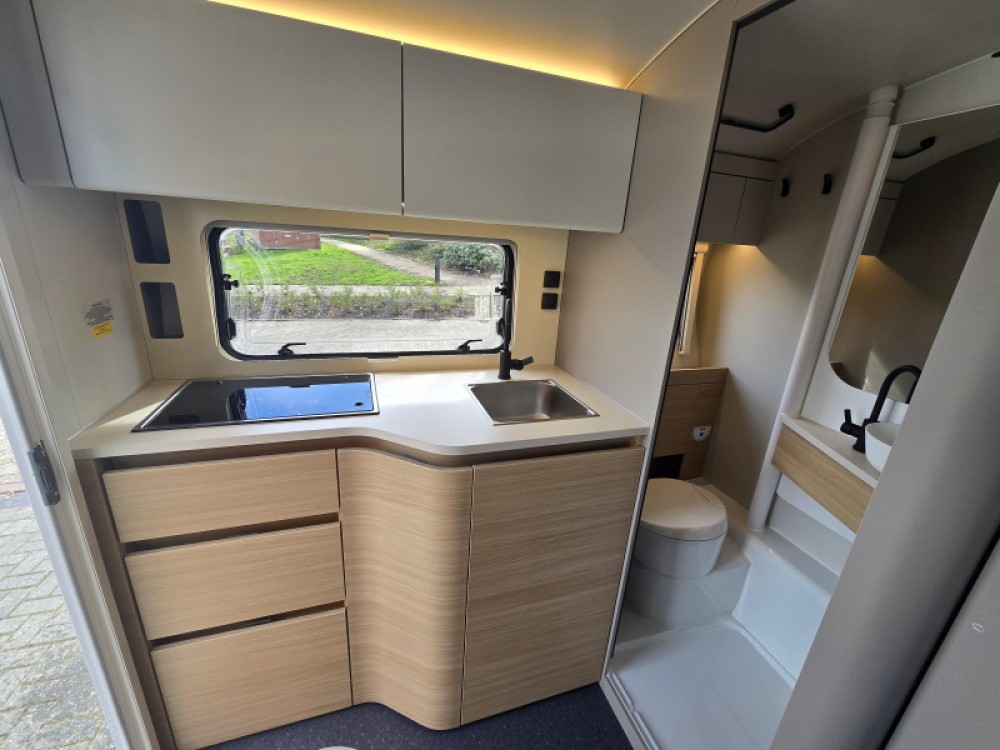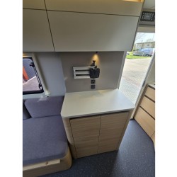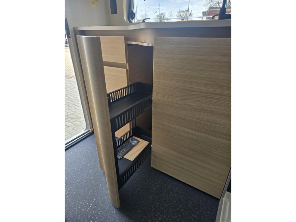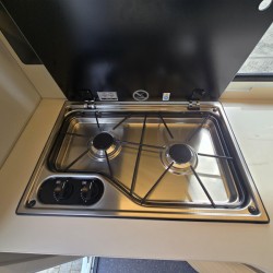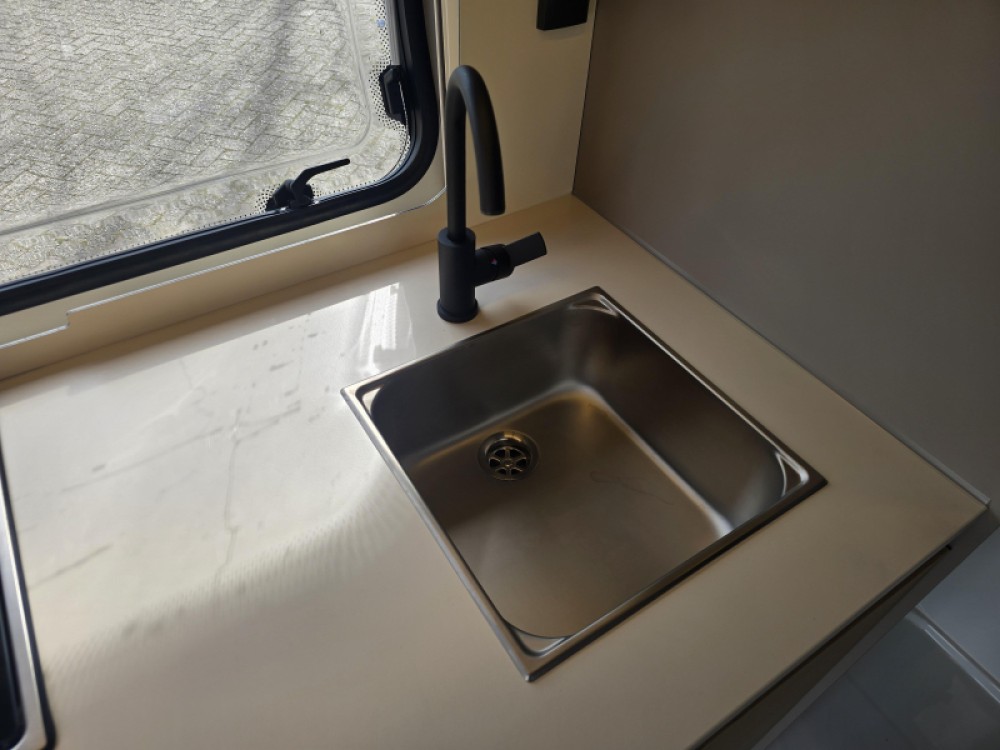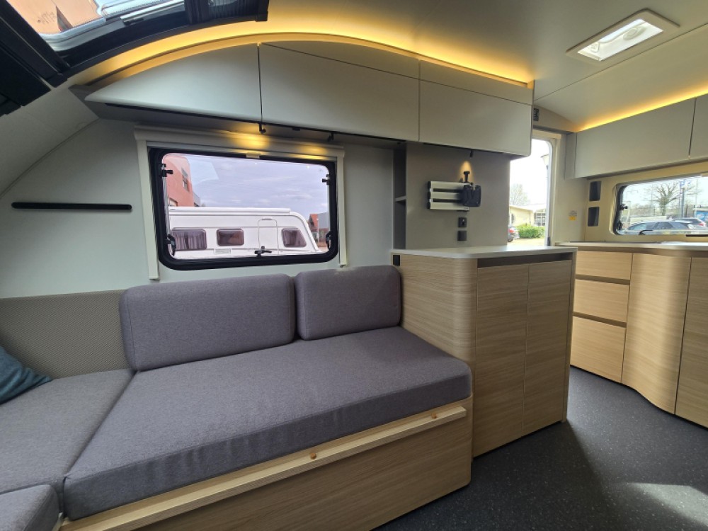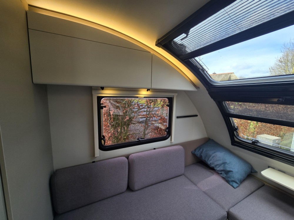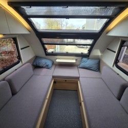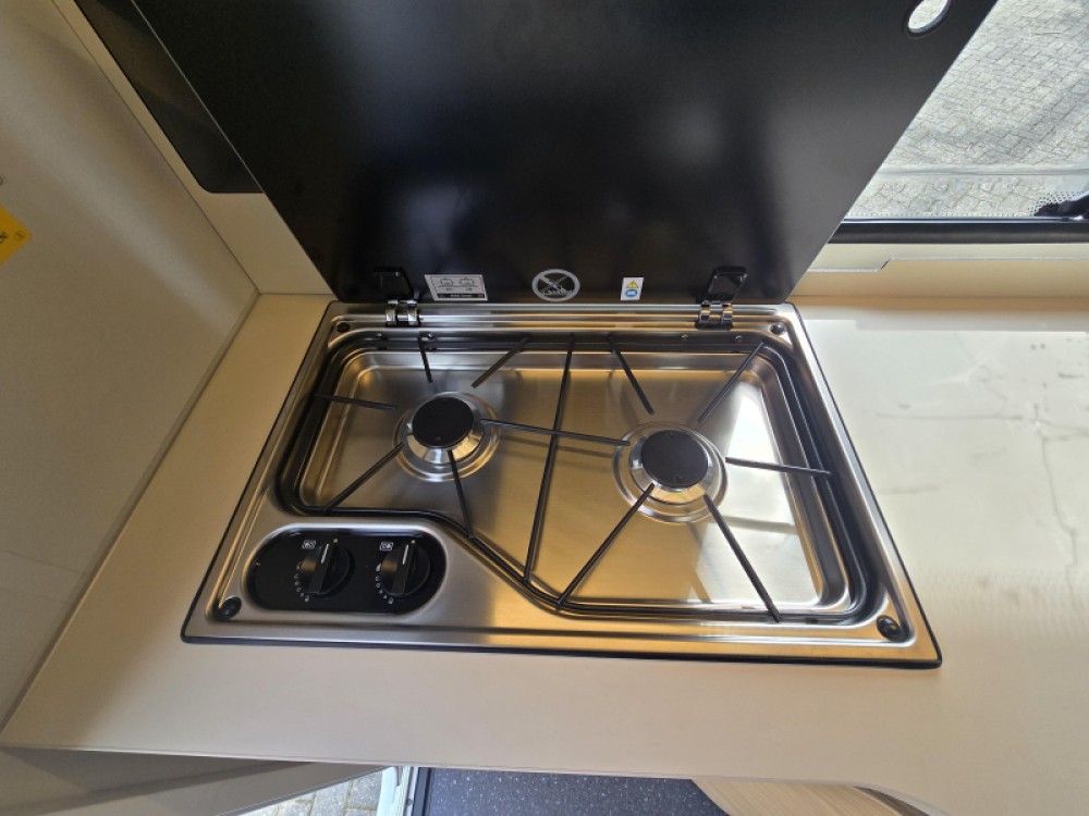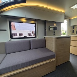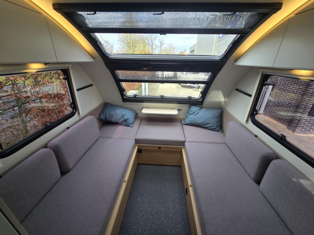 In de ruime treinzit vindt u een gezellige plek om te zitten, deze kan uiteraard ook dienen als extra slaapplaats. Geheel achterin de caravan bevindt zich de complete, praktische eindkeuken, die is voorzien van voldoende opbergmogelijkheden en een 2-pits kooktoestel en gootsteen met kraan. Er is een boiler aanwezig, die u van warm water voorziet. De ingebouwde koelkast met vriesvak is uitgevoerd in een ruime uitvoering. De keukenbenodigdheden vinden een plekje in de ladekast.