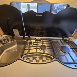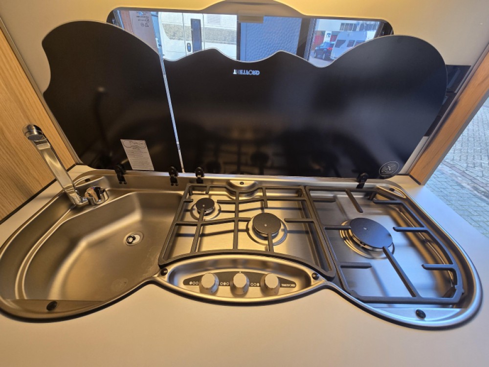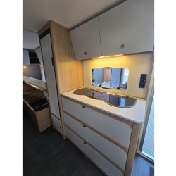 De riante rondzit is ideaal om gezellig aan te eten en te drinken, maar kan ook als extra slaapplaats dienen. Centraal in de caravan bevindt zich de complete middenkeuken. Er is een boiler aanwezig, die u van warm water voorziet. De koelkast met vriescompartiment is ruim genoeg voor al uw etenswaren. De praktische ladekast is een handige plek voor de keukenbenodigdheden.